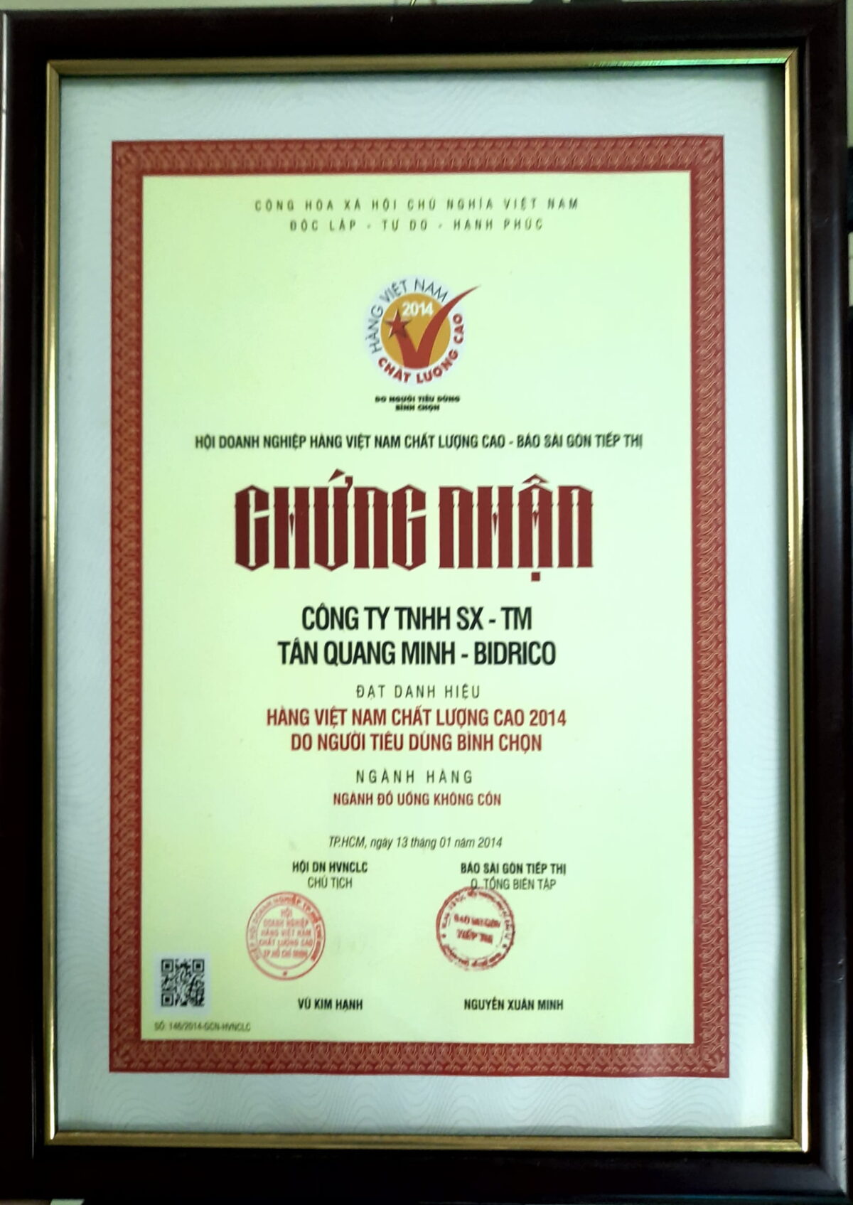 Tối ngày 25/02/2014 công ty TNHH SX&TM Tân Quang Minh – thương hiệu nước giải khát Bidrico vừa nhận danh hiệu Hàng Việt Nam chất lượng cao 2014 tại trung tâm hội nghị White Palace, quận Phú Nhuận, TPHCM.