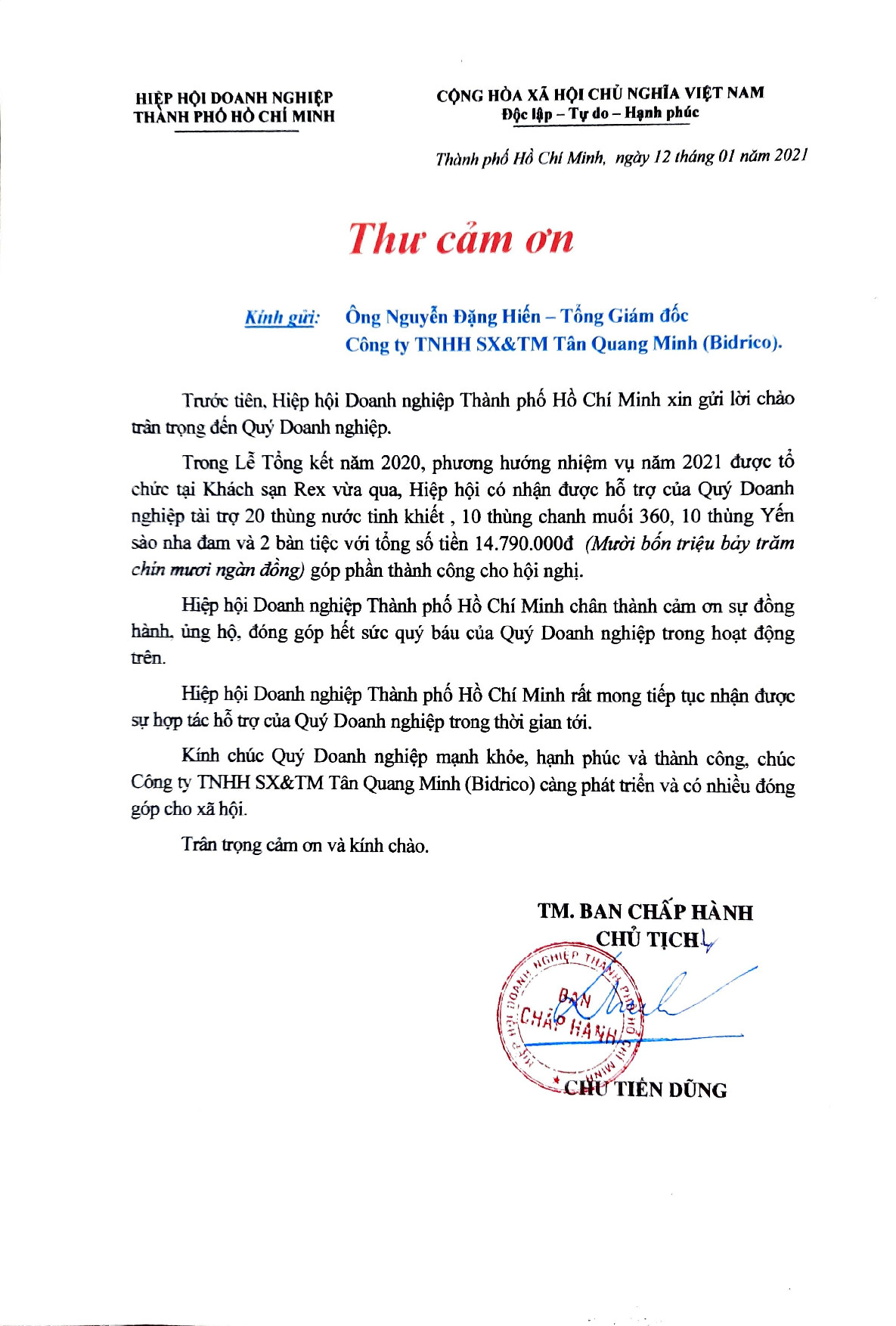 THƯ CẢM ƠN BIDRICO VÀ TGĐ NGUYỄN ĐẶNG HIẾN CỦA HIỆP HỘI DOANH NGHIỆP TP.HCM